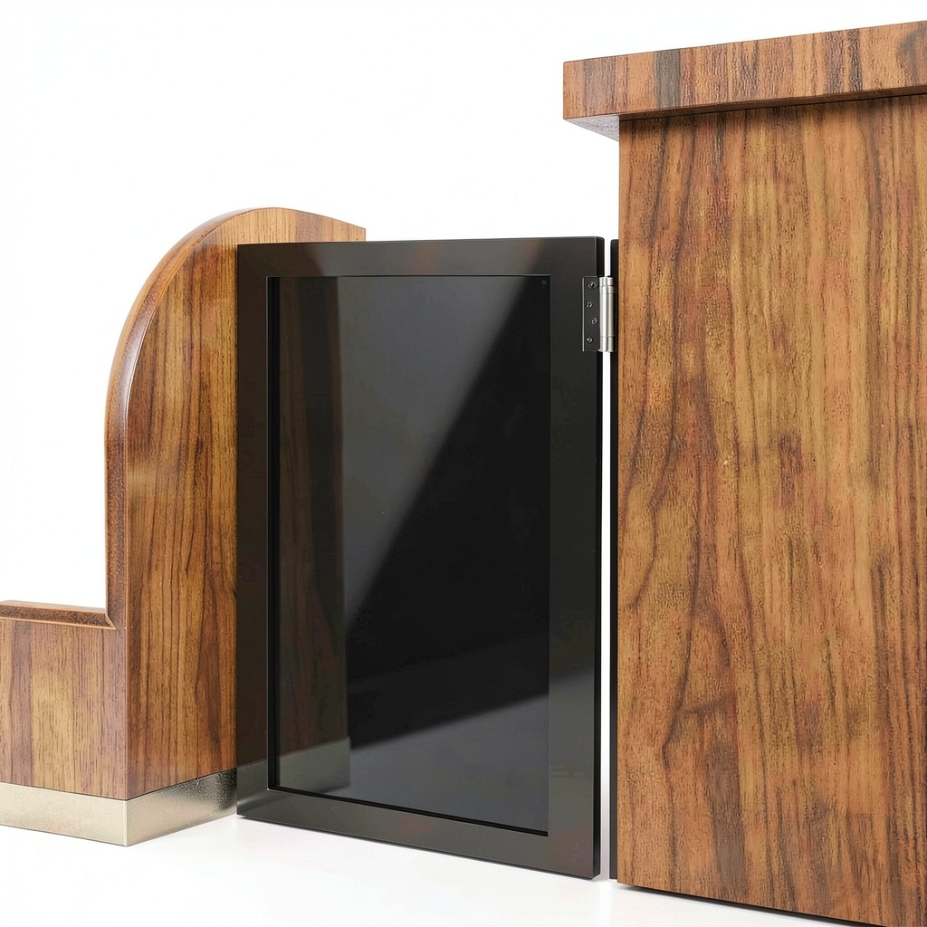 The door is crafted from solid wood and stainless steel, providing a sturdy and wear-resistant build that ensures durability over time.
